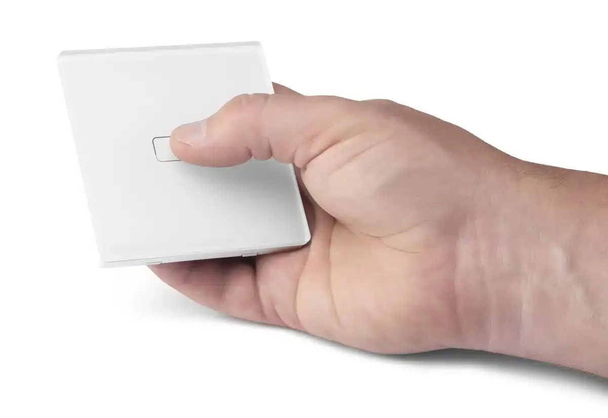 A remote control pad opens and closes the dimmer at the touch of the button.
